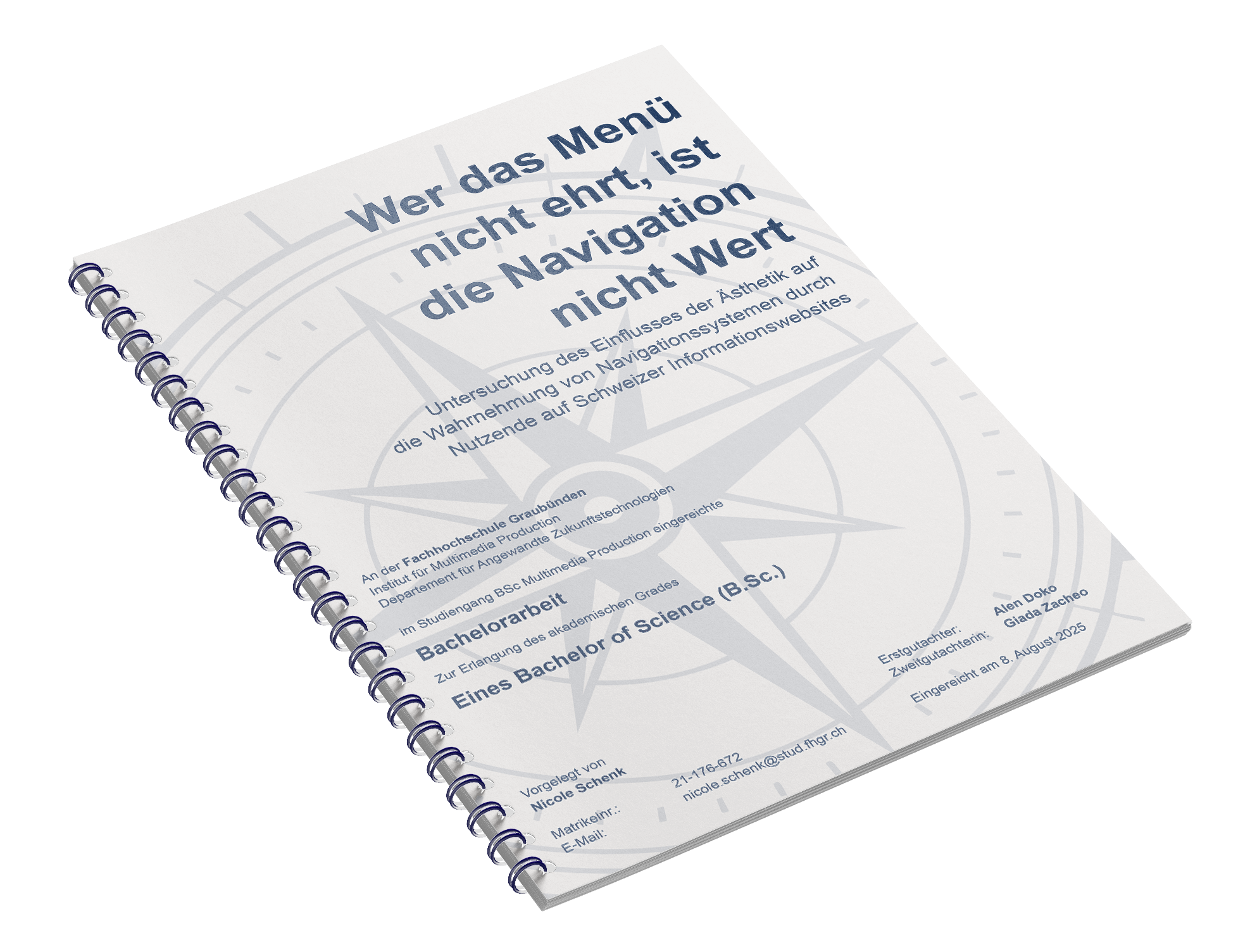 My bachelor thesis explores the relationship between visual aesthetics and navigation usability on swiss informational websites. The project investigates how design elements such as color, typography, and animation influence users’ perception of orientation, clarity, and overall usability within navigation systems.